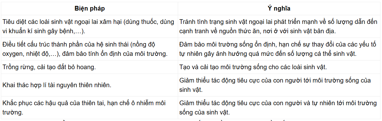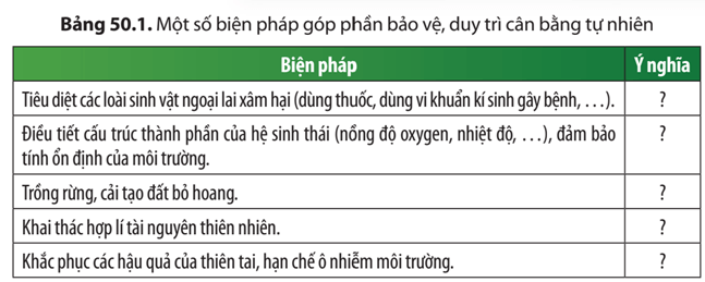Câu hỏi 3: Cho biết ý nghĩa của một số biện pháp được sử dụng để bảo vệ, duy trì cân bằng tự nhiên được nêu trong Bảng 50.1.
