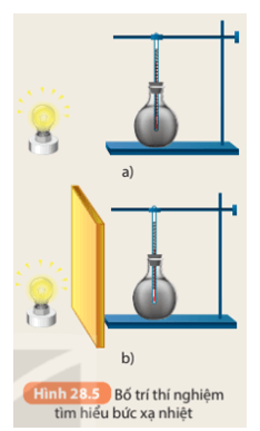 - Đặt tấm gỗ vào giữa đèn và bình thủy tinh (Hình 28.5b), theo dõi sự thay đổi nhiệt độ của nhiệt kế.