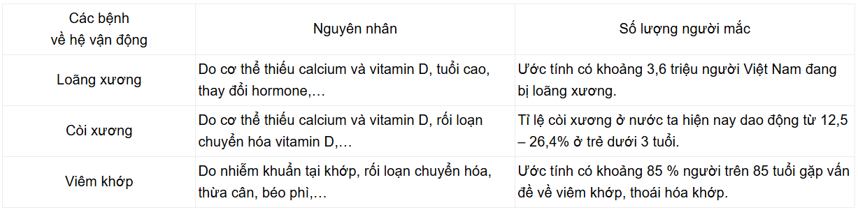 Hoạt động 2 SGK Khoa học tự nhiên 8 Kết nối tri thức Bài 31 (trang 126): Tìm hiểu các bệnh về hệ vận động (nguyên nhân, số lượng người mắc) trong trường học và khu dân cư; đề xuất và tuyên truyền biện pháp phòng bệnh, bảo vệ hệ vận động.