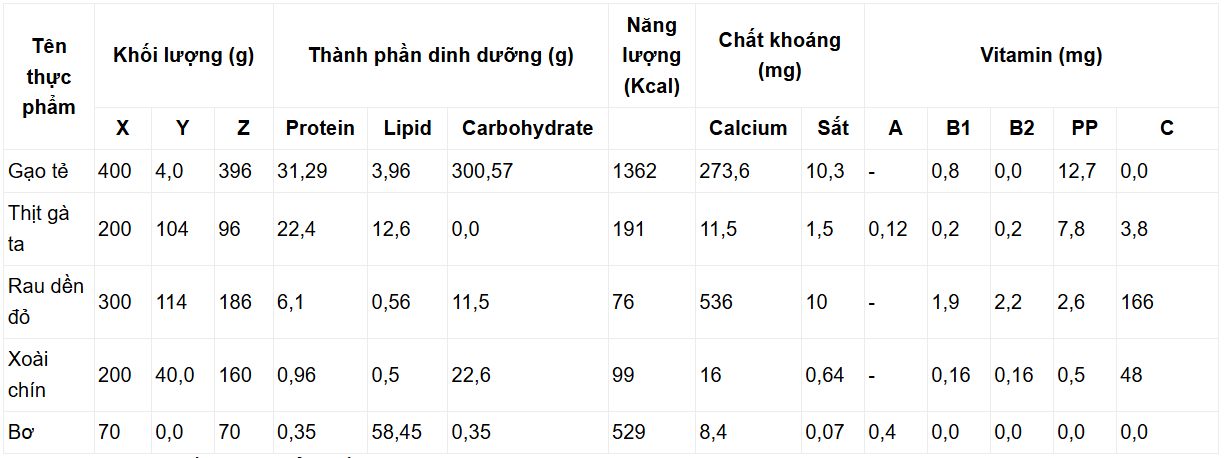 Xác định tên thực phẩm và lượng thực phẩm ăn được (Z), Z = X - Y. Trong đó X là khối lượng cung cấp, Y là lượng thải bỏ, Y = X x tỉ lệ thải bỏ.