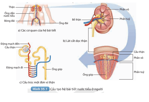 Câu hỏi SGK Khoa học tự nhiên 8 Kết nối tri thức Bài 35 (trang 146): Đọc đoạn thông tin trên kết hợp với quan sát Hình 35.1, kể tên các cơ quan của hệ bài tiết nước tiểu và các bộ phận chủ yếu của thận.
