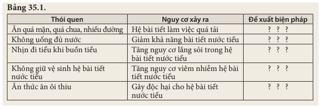 Đọc thông tin trong bảng 35.1 và đề xuất biện pháp phù hợp để bảo vệ hệ bài tiết rồi hoàn thành bảng theo mẫu bảng 35.1