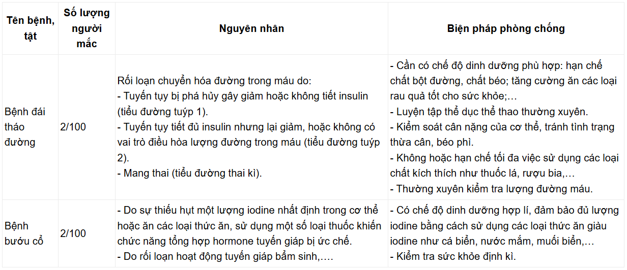 1. Bệnh đái tháo đường và bướu cổ có những biểu hiện nào trên cơ thế? Em hãy đề xuất biện pháp phòng chống các bệnh này.