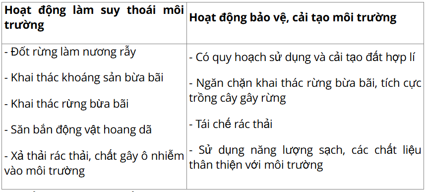 2. Liệt kê một số hoạt động của con người trong các thời kì phát triển xã hội làm suy thoái hoặc có tác dụng bảo vệ, cải tạo môi trường tự nhiên.