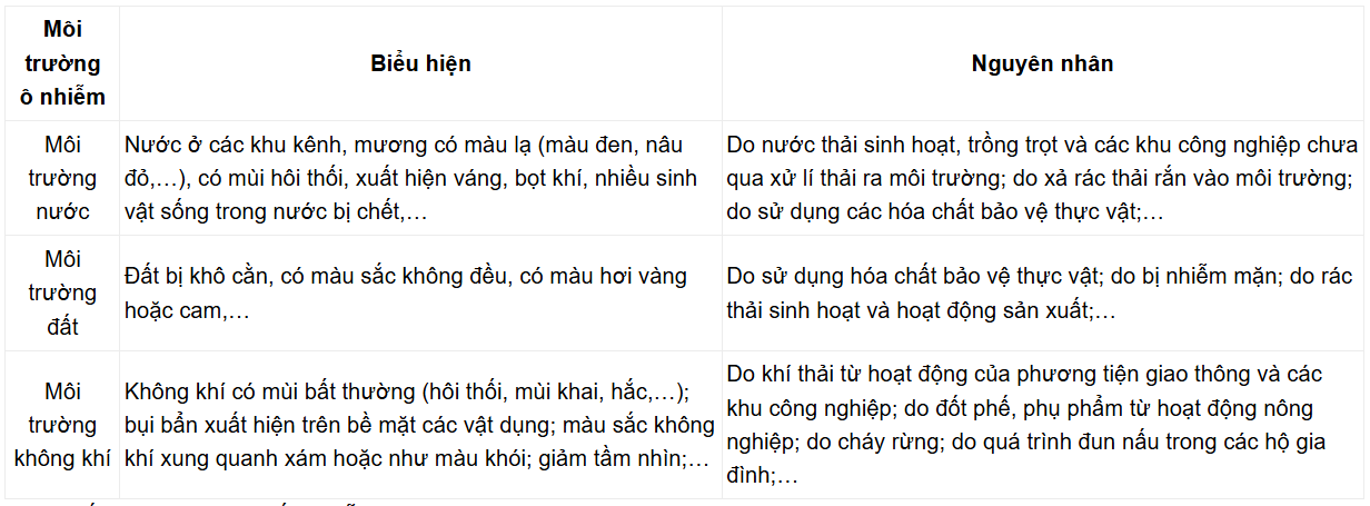 1. Điều tra về tình trạng ô nhiễm môi trường ở địa phương, nêu các biểu hiện và tìm hiểu nguyên nhân gây ra tình trạng đó rồi hoàn thành thông tin theo mẫu Bảng 47.1.