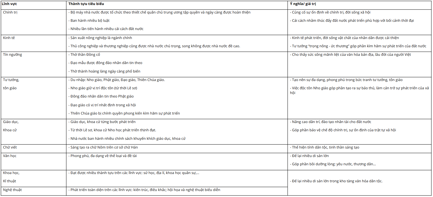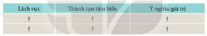 Luyện tập 1 SGK Lịch sử 10 Kết nối tri thức Bài 12 (trang 122): Lập bảng thống kê những thành tựu tiêu biểu của nền văn minh Đại Việt theo gợi ý dưới đây: