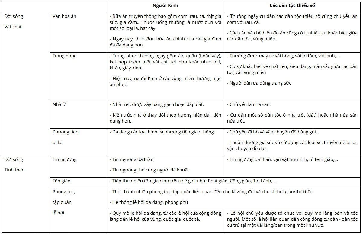 Luyện tập 2 SGK Lịch sử 10 Kết nối tri thức Bài 13 (trang 135): Lập bảng thể hiện một số nét chính về đời sống vật chất, tinh thần của cộng đồng các dân tộc Việt Nam.