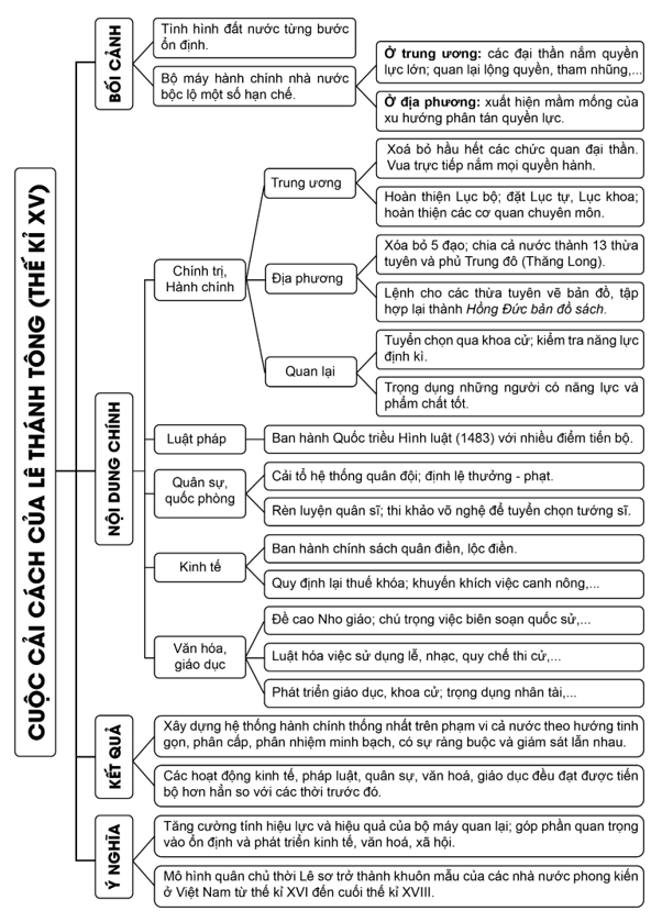 Luyện tập 1 SGK Lịch sử 11 Kết nối tri thức Bài 10 (trang 68): Lập sơ đồ tư duy về bối cảnh lịch sử, nội dung chủ yếu và kết quả, ý nghĩa cải cách của vua Lê Thánh Tông.