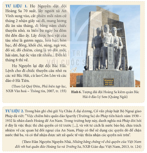 – Đoạn tư liệu 1: Trong các thế kỉ XVII – XIX, Việt Nam thông qua việc thành lập và hoạt động của các hải đội Hoàng Sa và Bắc Hải đã thực hiện các hoạt động xác lập chủ quyền, quản lí liên tục đối với quần đảo Hoàng Sa, quần đảo Trường Sa.