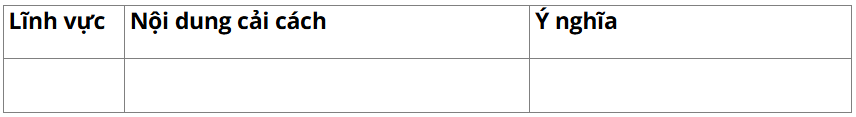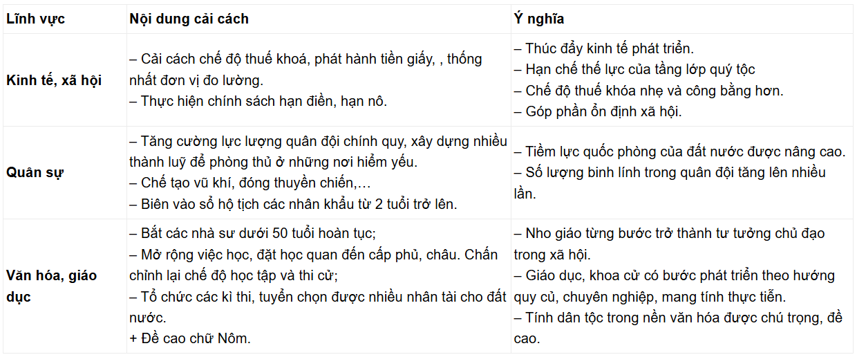 – Nội dung: Hồ Quý Ly đã từng bước tiến hành nhiều chính sách cải cách khá hệ thống trên hầu hết các lĩnh vực (kinh tế, xã hội, quân sự, văn hóa, giáo dục,…) từ cuối thế kỉ XIV nhằm giải quyết các mâu thuẫn về kinh tế, củng cố chế độ quân chủ tập quyền xã hội xuất hiện cuối thời Trần.