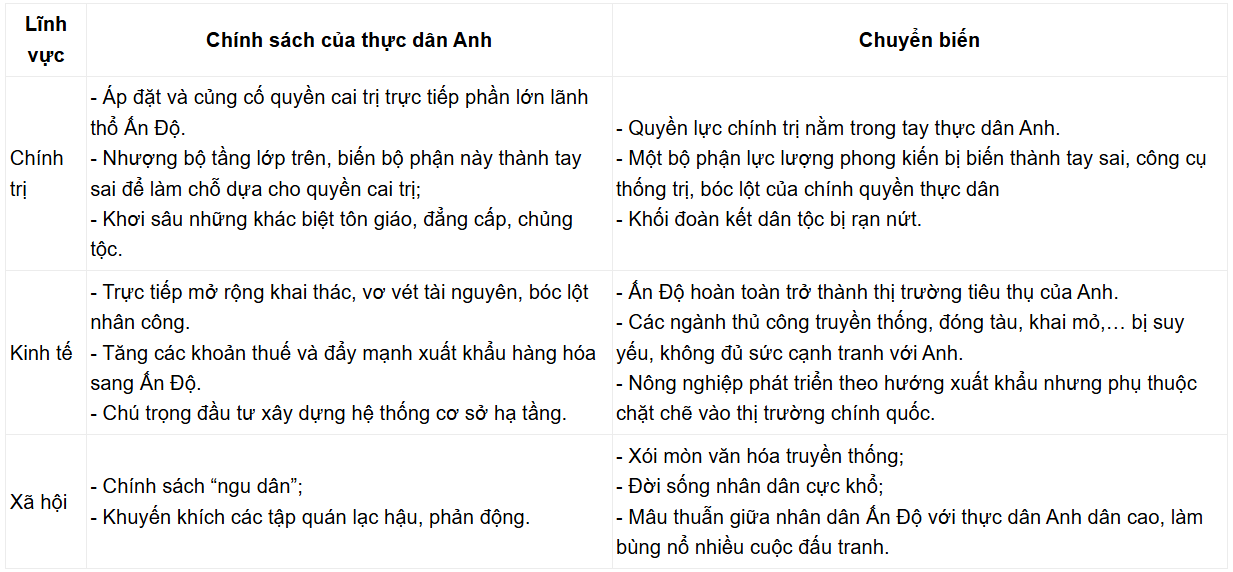 - Giữa thế kỉ XIX, thực dân Anh đã hoàn thành công cuộc xâm chiếm toàn bộ đất đai và đặt ách cai trị ở Ấn Độ. Dưới ách cai trị của thực dân Anh, hình Ấn Độ có sự chuyển biến toàn diện trên các lĩnh vực chính trị, kinh tế, xã hội.