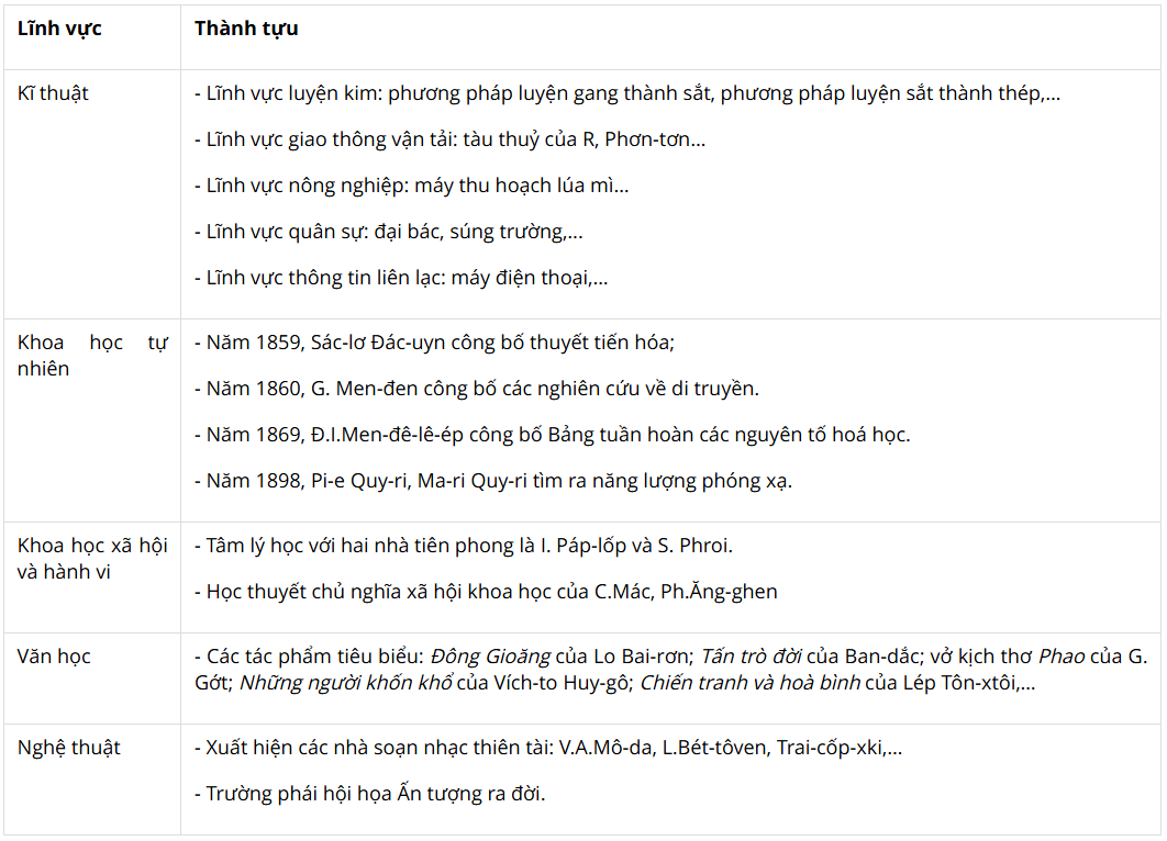 - Những thành tựu chủ yếu về kĩ thuật trong thế kỉ XIX: