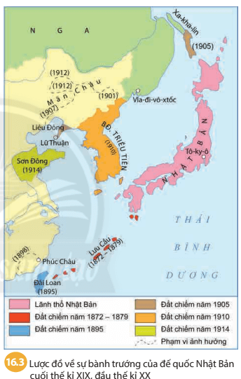 Câu hỏi mục 2 SGK Lịch sử 8 Chân trời sáng tạo Bài 16 (trang 67): Quan sát lược đồ 16.3 và dựa vào thông tin trong bài, em hãy nêu những biểu hiện của sự hình thành chủ nghĩa đế quốc ở Nhật Bản vào cuối thế kỉ XIX, đầu thế kỉ XX.