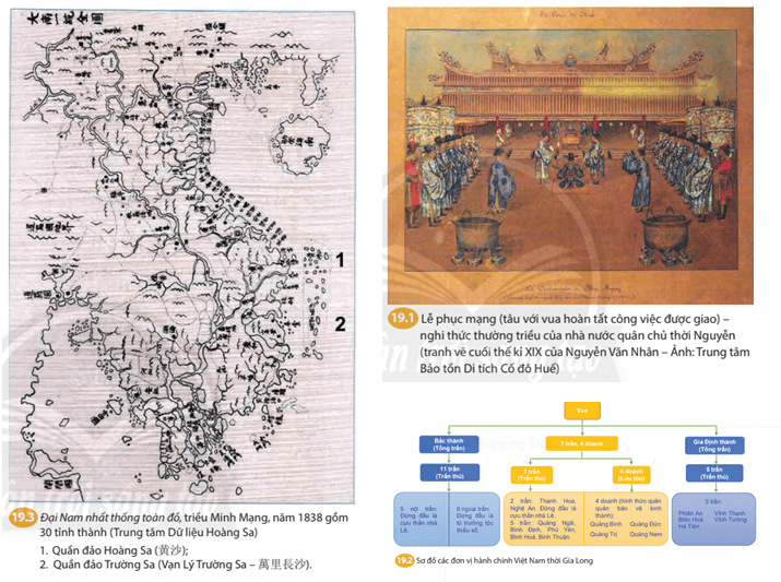 Câu hỏi 1 SGK Lịch sử 8 Chân trời sáng tạo Bài 19 (trang 73): Dựa vào thông tin trong bài, quan sát tư liệu 19.1, 19.3, sơ đồ 19.2, em hãy trình bày những nét chính về tình hình chính trị của Việt Nam thời nhà Nguyễn và nêu sự khác nhau về cơ cấu hành chính tiệt Nam thời Gia Long và Minh Mạng.