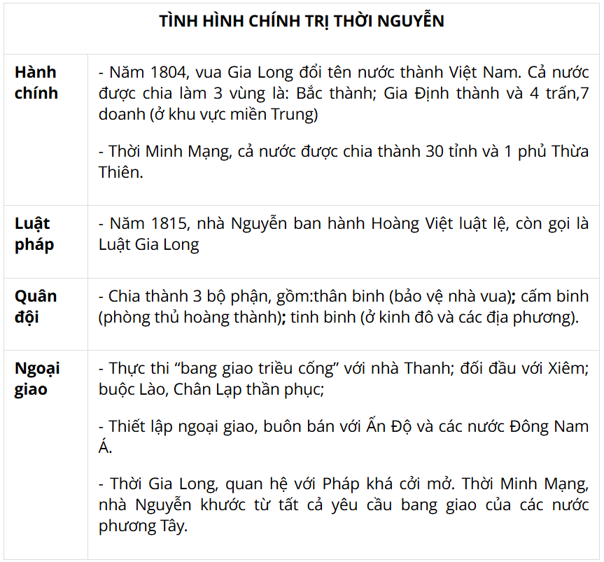 Câu hỏi Luyện tập SGK Lịch sử 8 Chân trời sáng tạo Bài 19 (trang 79): Lập bảng tóm tắt tình hình chính trị thời Nguyễn theo các mục sau: hành chính, luật pháp, quân đội, ngoại giao.