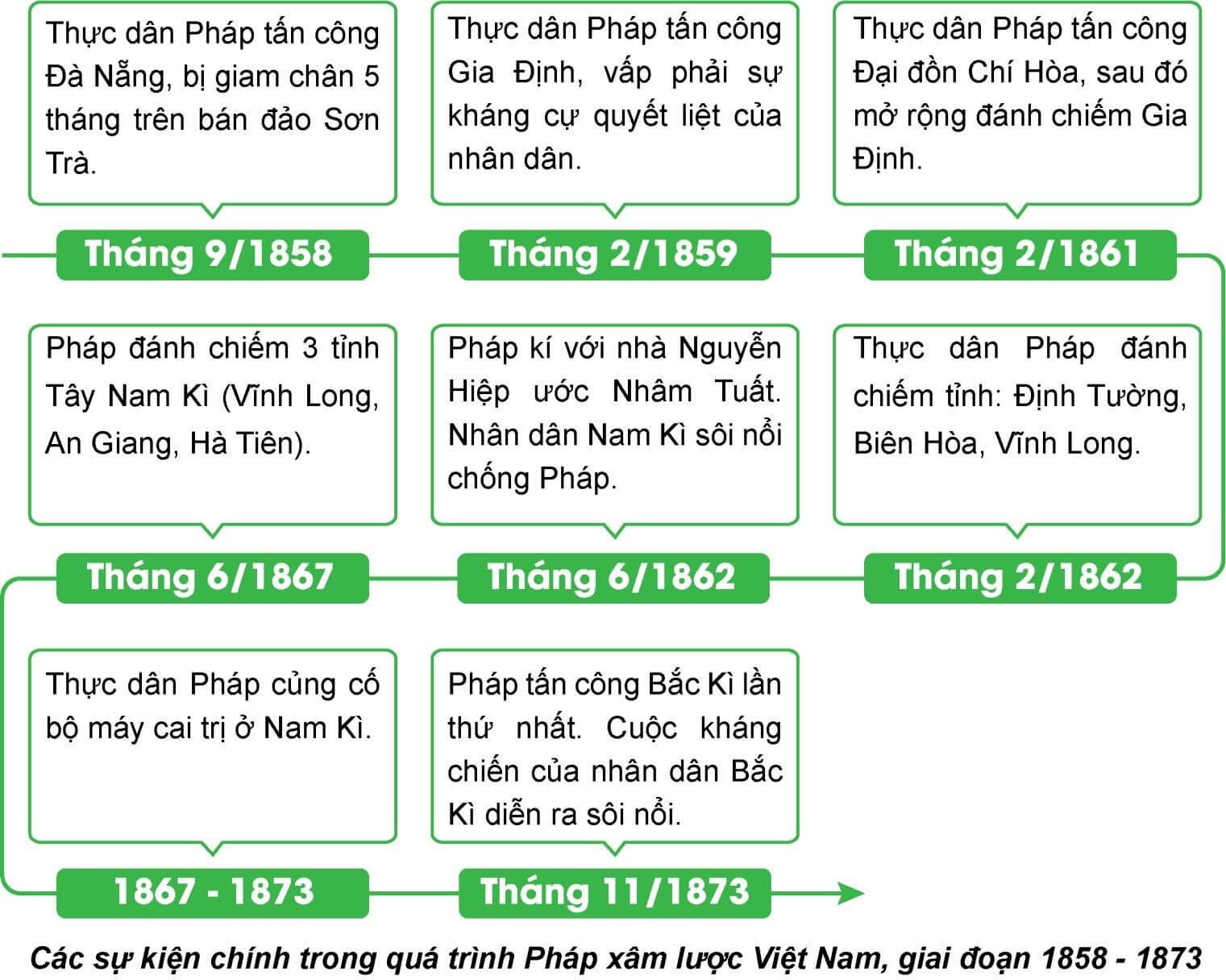 Câu hỏi 1 SGK Lịch sử 8 Chân trời sáng tạo Bài 20 (trang 80): Lập sơ đồ những sự kiện chính xảy ra trong quá trình Pháp xâm lược Việt Nam từ năm 1858 đến năm 1873