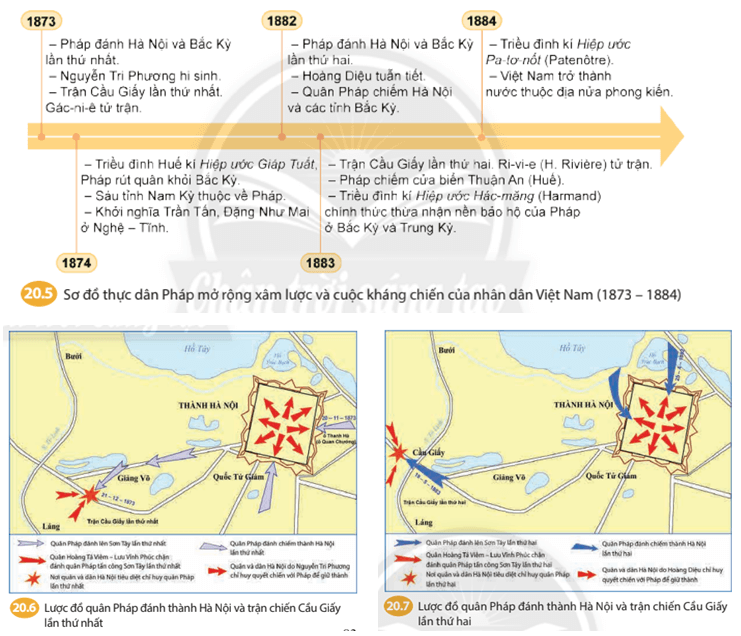 Câu hỏi mục 2 SGK Lịch sử 8 Chân trời sáng tạo Bài 20 (trang 83): Dựa vào sơ đồ 20.5, lược đồ 20.6, 20.7 và thông tin trong bài, em hãy trình bày những sự kiện chính về quá trình Pháp xâm lược và cuộc kháng chiến của quân dân Việt Nam giai đoạn 1873 - 1884.