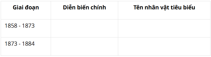 Câu hỏi Luyện tập SGK Lịch sử 8 Chân trời sáng tạo Bài 20 (trang 84): Dựa vào nội dung bài học, hoàn thành bảng thống kê kiến thức về phong trào kháng chiến chống Pháp của nhân dân ta từ năm 1858 đến năm 1884 theo mẫu.