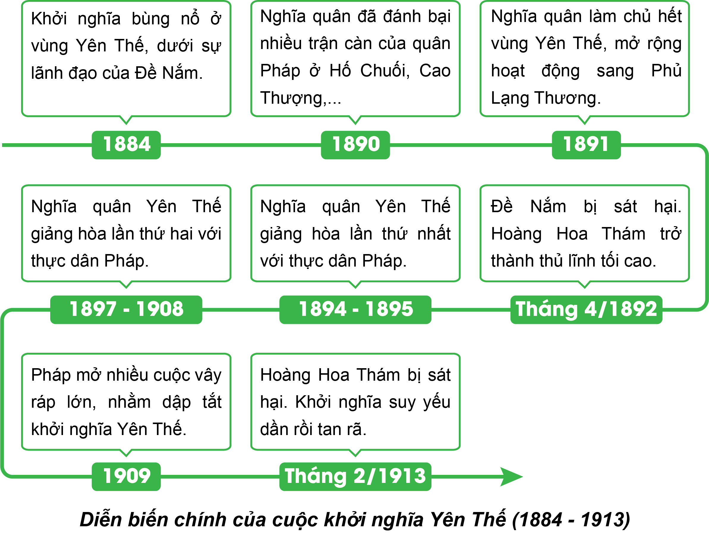 Câu hỏi SGK Lịch sử 8 Chân trời sáng tạo Bài 21 (trang 87): Em hãy xây dựng một trục thời gian từ năm 1884 đến năm 1913 thể hiện những diễn biến chính của cuộc khởi nghĩa Yên Thế.