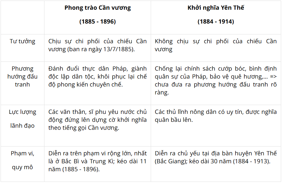 - Cuối thế kỉ XIX, ở Việt Nam đã diễn ra phong trào Cần vương (1885 - 1896) và phong trào nông dân Yên Thế (1884 - 1913). Đây là các phong trào đấu tranh yêu nước theo khuynh hướng phong kiến, lôi cuốn đông đảo các tầng lớp nhân dân tham gia. Mặc dù diễn ra sôi nổi, quyết liệt, nhưng các cuộc đấu tranh này chưa đi đến thắng lợi cuối cùng.