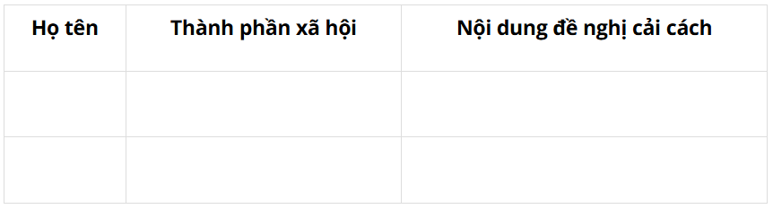 Câu hỏi Luyện tập SGK Lịch sử 8 Chân trời sáng tạo Bài 22 (trang 89): Hoàn thành bảng thống kê các nhà cải cách ở Việt Nam nửa sau thế kỉ XIX theo mẫu dưới đây:
