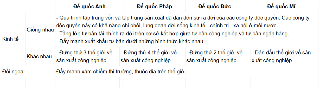 Câu 2. Hãy lập bảng so sánh (điểm giống và khác nhau) về kinh tế, chính sách đối ngoại nổi bật của các đế quốc Anh, Pháp, Đức, Mỹ.