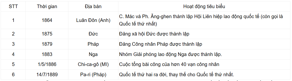 - Sự ra đời của các đảng công nhân: Đảng Xã hội Đức (1875), Đảng Công nhân Pháp (1879), nhóm Giải phóng lao động Nga (1883).