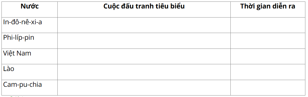 Câu 1: Hãy lập và hoàn thành bảng thống kê (theo gợi ý dưới đây) về một số cuộc đấu tranh tiêu biểu của nhân dân Đông Nam Á chống chủ nghĩa thực dân.