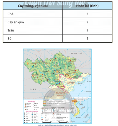 Dựa vào hình 24.2, xác định sự phân bố một số cây trồng, vật nuôi ở vùng Trung du và miền núi Bắc Bộ, hoàn thành thông tin theo bảng dưới đây vào vở: