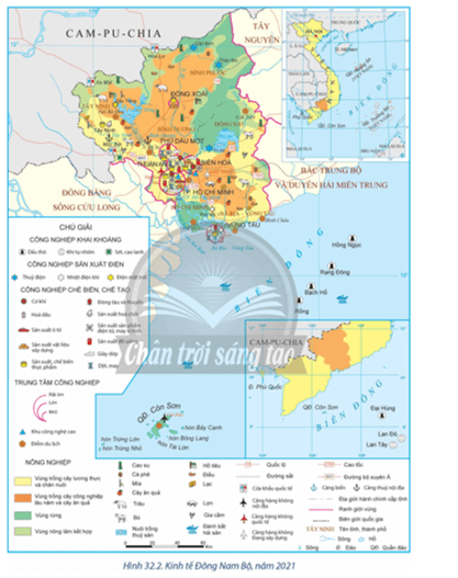 Dựa vào hình 32.2, lựa chọn 3 trung tâm công nghiệp của vùng Đông Nam Bộ và xác định các ngành công nghiệp tại các trung tâm công nghiệp đã chọn.
