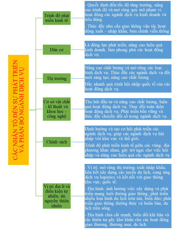 Luyện tập: Lập sơ đồ thể hiện ảnh hưởng của các nhân tố đến sự phát triển và phân bố ngành dịch vụ của nước ta.
