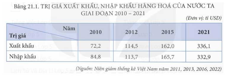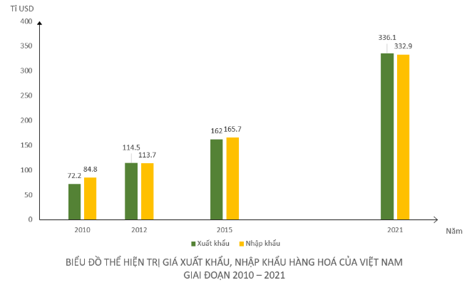 Trị giá xuất, nhập khẩu hàng hóa của nước ta giai đoạn 2010 – 2021 tăng đều qua các năm. Cụ thể: