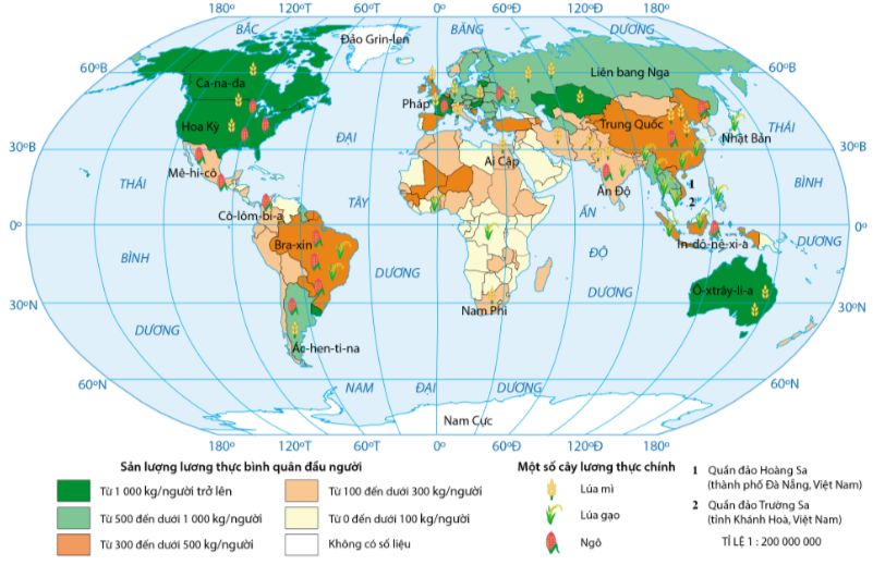 Câu 2: Đọc thông tin và quan sát hình 21.1, hãy nhận xét và giải thích sự phân bố các cây lương thực chính trên thế giới.