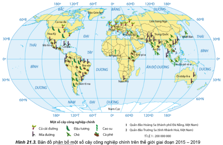Câu 3: Đọc thông tin và quan sát hình 21.3, hãy nhận xét và giải thích sự phân bố các cây công nghiệp chính trên thế giới.