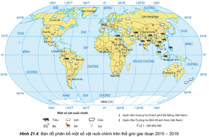 Câu 5: Đọc thông tin và quan sát hình 21.4, hãy nhận xét và giải thích sự phân bố một số vật nuôi chính trên thế giới.