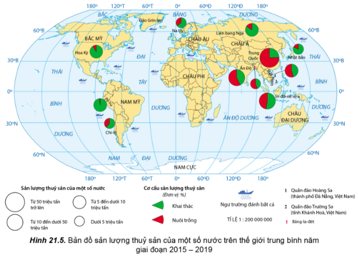 - Những nước có sản lượng thuỷ sản từ 5 triệu tấn đến dưới 10 triệu tấn: Pê-ru, Hoa Kỳ, Việt Nam, Liên Bang Nga.