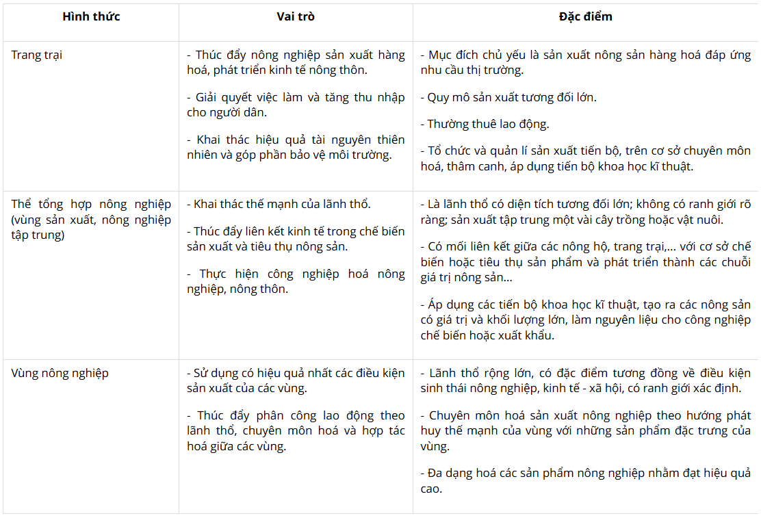 Câu 2: Dựa vào bảng 22, hãy trình bày vai trò, đặc điểm của một trong những hình thức tổ chức lãnh thổ nông nghiệp.
