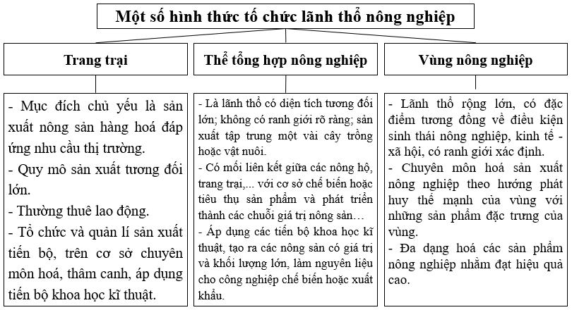 Câu hỏi: Hãy lập sơ đồ để hệ thống hóa đặc điểm của các hình thức tổ chức lãnh thổ nông nghiệp.