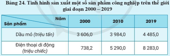 b) Hãy phân tích tình hình sản xuất dầu mỏ và điện thoại di động thế giới.