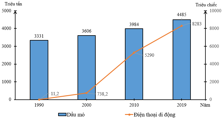 a) Hãy vẽ biểu đồ kết hợp (cột và đường) thể hiện sản lượng khai thác dầu mỏ và sản xuất điện thoại di động trên thế giới giai đoạn 1990 - 2019.