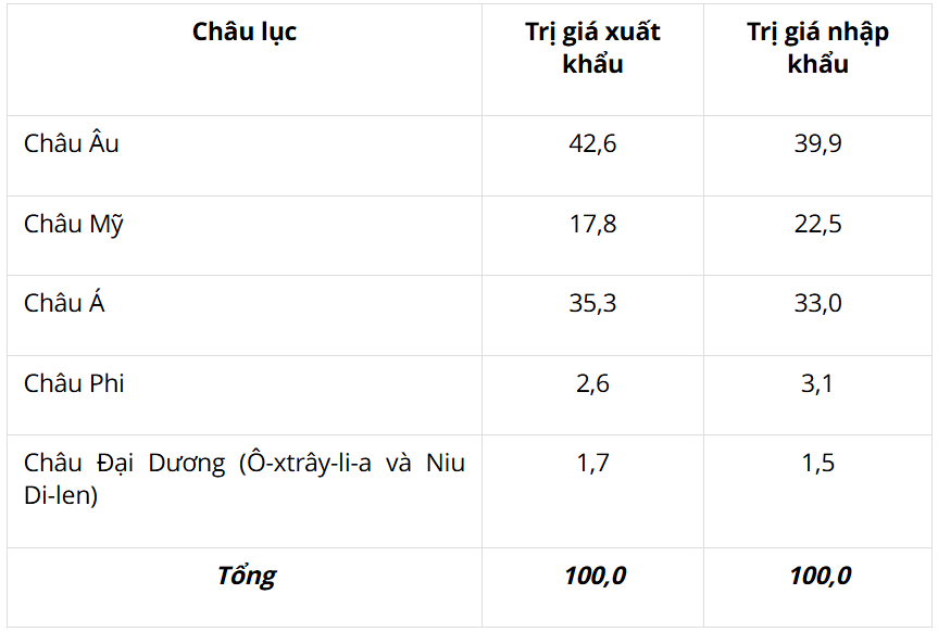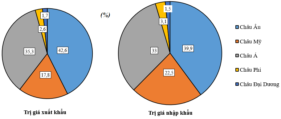 - Tỉ trọng giá trị xuất khẩu: Châu Âu lớn nhất (42,6%), tiếp đến là châu Á (35,3%), châu Mỹ (17,8%), chiếm tỉ trọng thấp nhất là châu Đại Dương (1,7%).