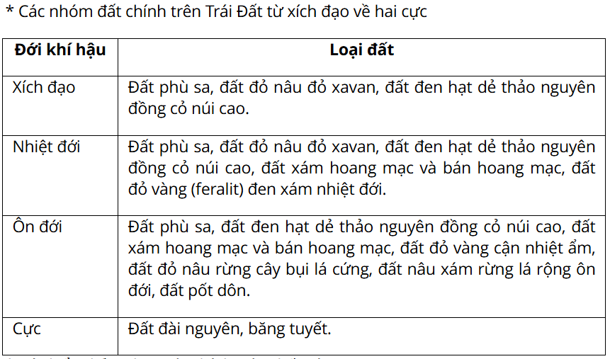 => Giải thích: Do sự phân bố các kiểu thảm thực vật và các nhóm đất có tuân theo quy luật địa đới, ở mỗi đới khí hậu khác nhau có nhóm đất và thảm thực vật khác nhau.