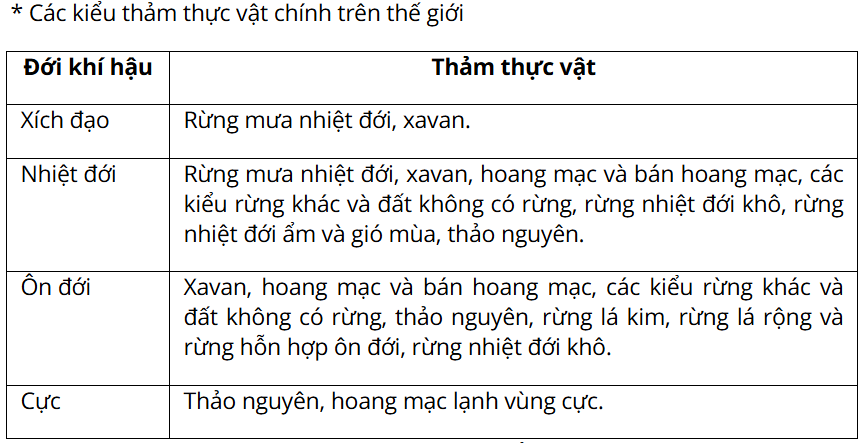 - Nhận xét đặc điểm phân bố của các nhóm đất và các kiểu thảm thực vật chính theo vĩ độ.