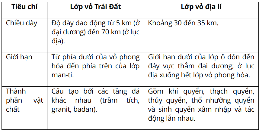 - So sánh sự khác nhau về giới hạn, chiều dày và thành phần cấu tạo giữa vỏ địa lí và vỏ Trái Đất.