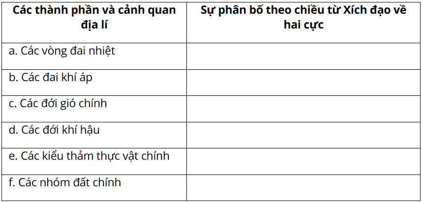 Luyện tập 1: Dựa vào kiến thức đã học, em hãy tóm tắt các biểu hiện của quy luật địa đới qua thành phần và cảnh quan địa lí, sau đó hoàn thành thông tin theo bảng gợi ý dưới đây: