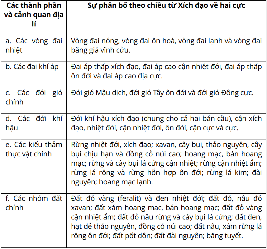 * Biểu hiện của quy luật địa đới là sự phân bố một cách có quy luật, theo chiều từ Xích đạo về hai cực của nhiều thành phần và cảnh quan địa lí.