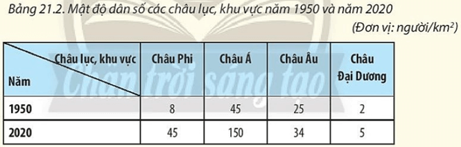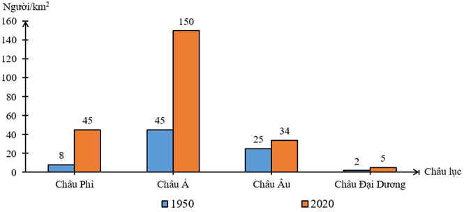 + Mật độ dân số của châu Á tăng 105 người/km2, châu Phi tăng 37 người/km2, châu Âu tăng 9 người/km2 và châu Đại Dương tăng 3 người/km2 trong giai đoạn 1950 - 2020.