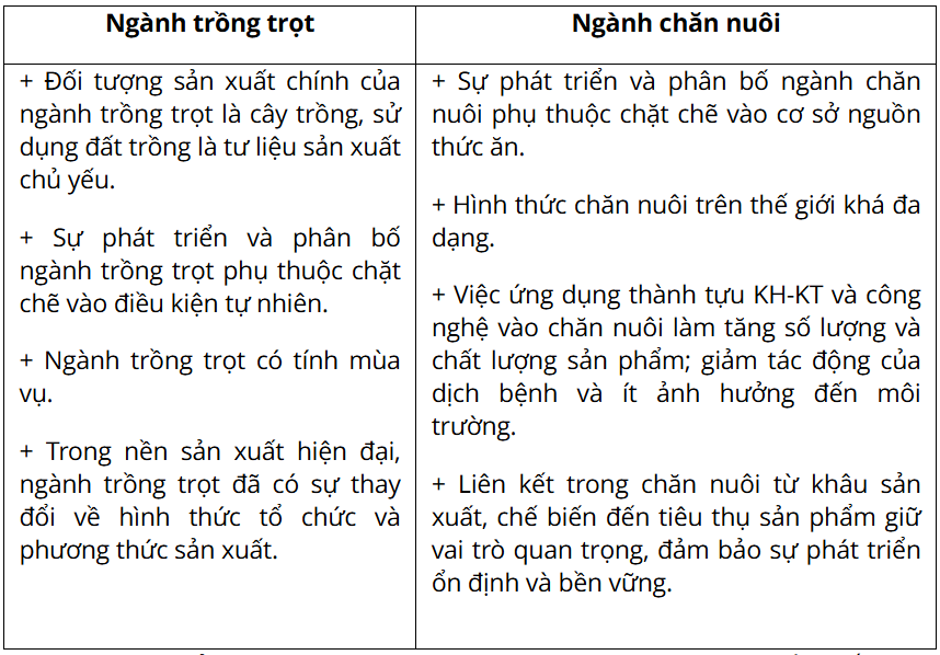Luyện tập 1 (trang 104) Địa Lí 10 Chân trời sáng tạo Bài 26: Hãy so sánh đặc điểm của ngành trồng trọt và chăn nuôi.