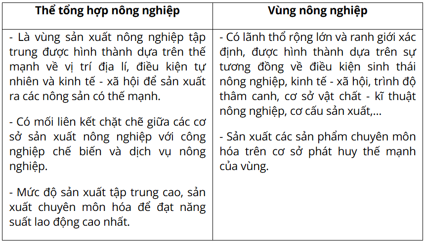 Em hãy phân biệt sự khác nhau về đặc điểm của thể tổng hợp nông nghiệp và vùng nông nghiệp.
