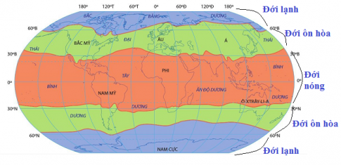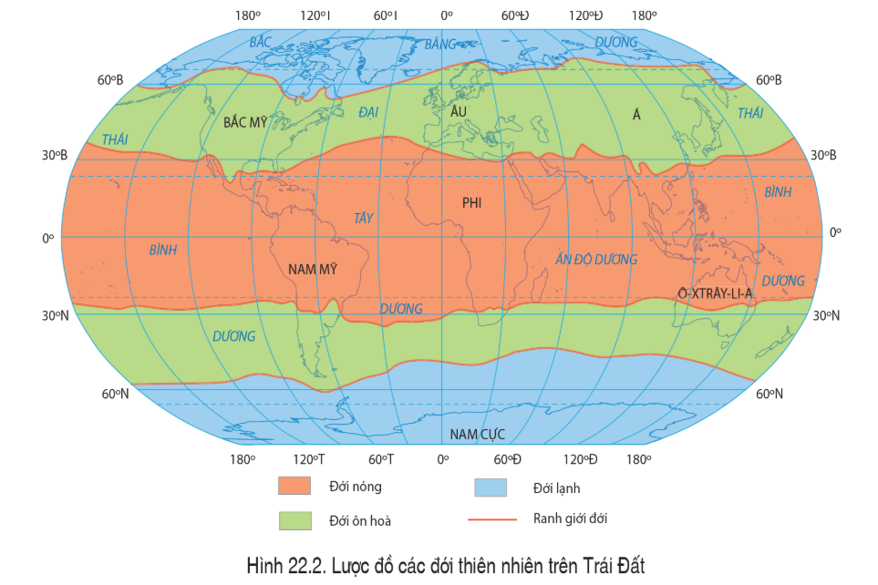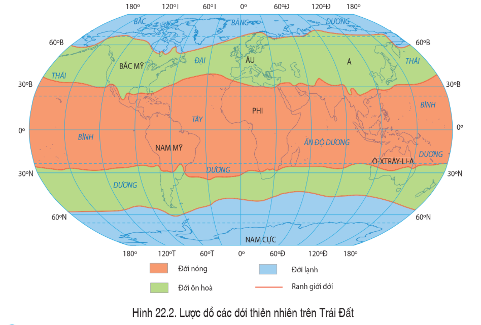 Câu hỏi SGK Địa lí 6 Cánh Diều Bài 22 (trang 181): Quan sát hình 22.2, hãy kể tên và xác định trên lược đồ các đới thiên nhiên Trái Đất?